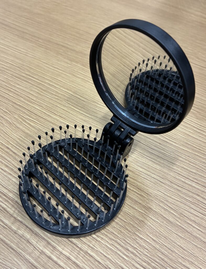 このスタイルを支えてくれているのは、「100円ショップ」で買い求めた携帯用の柔らかいヘアブラシです。二つ折りで小さく、かさばらないブラシで、100円なのでいくつも購入して、鞄の中、デスクの引き出し、洗面所、リビング、寝室と、家や職場のあちこちに置いてあります。ちょっと気になったときに、すっと手を伸ばして軽く数回とかすことで、頭の周囲がすっと整い、自分の輪郭が少しシャープになったような気がします。