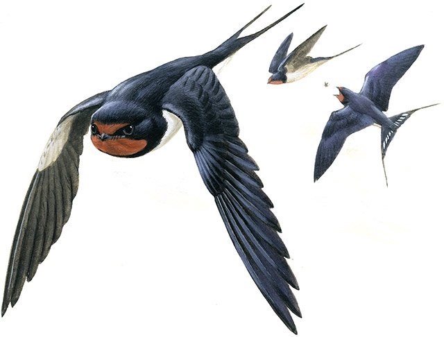 燕尾服の由来となった長い尾を持つお馴染みの鳥です。南の国からやって来る渡り鳥の代表で、4月に来て繁殖をしたツバメは、10月に台湾を経由してフィリピンやマレーシアに渡り、越冬する事が知られています。