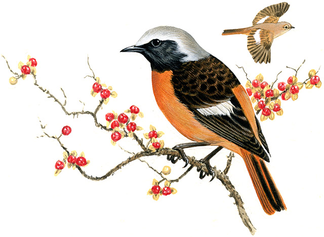 | ② | 〃 | ジョウビタキ | 14㎝ | 冬鳥 | 雄は灰色の頭、胸と腹が橙色 |